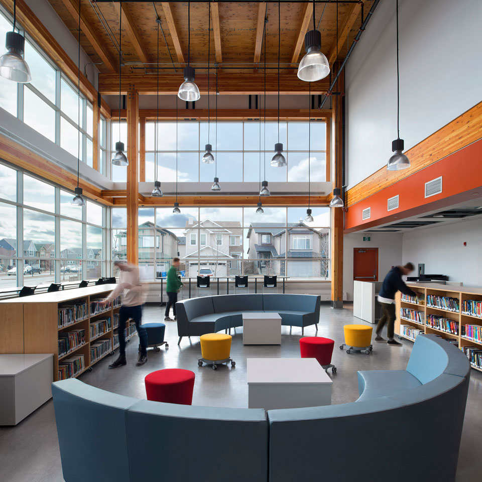 The unique school utilized non-traditional building construction methods and materials such as prefabricated wood panels, cross laminated timbers, precast concrete panels and exposed mechanical and electrical systems within the ceiling space.